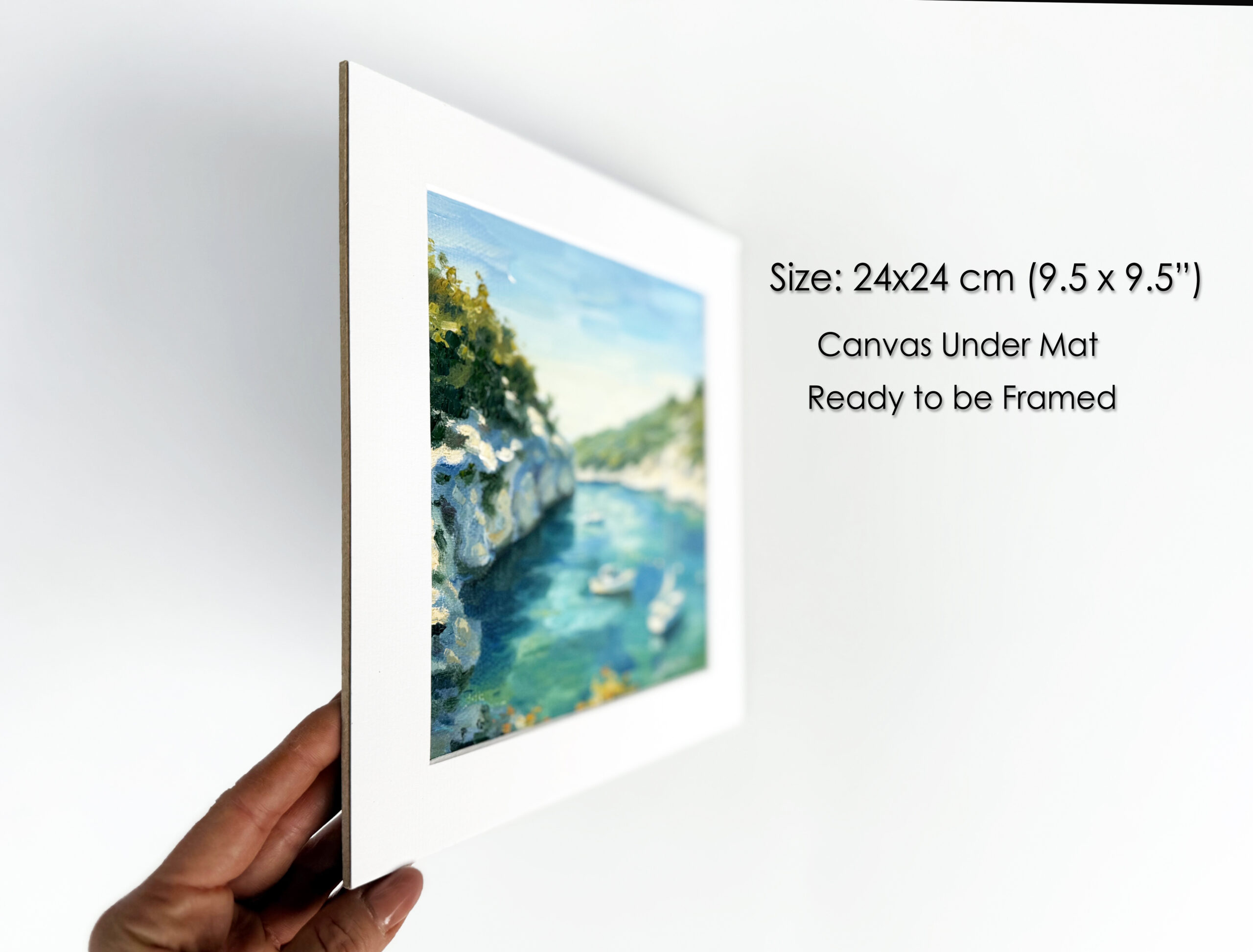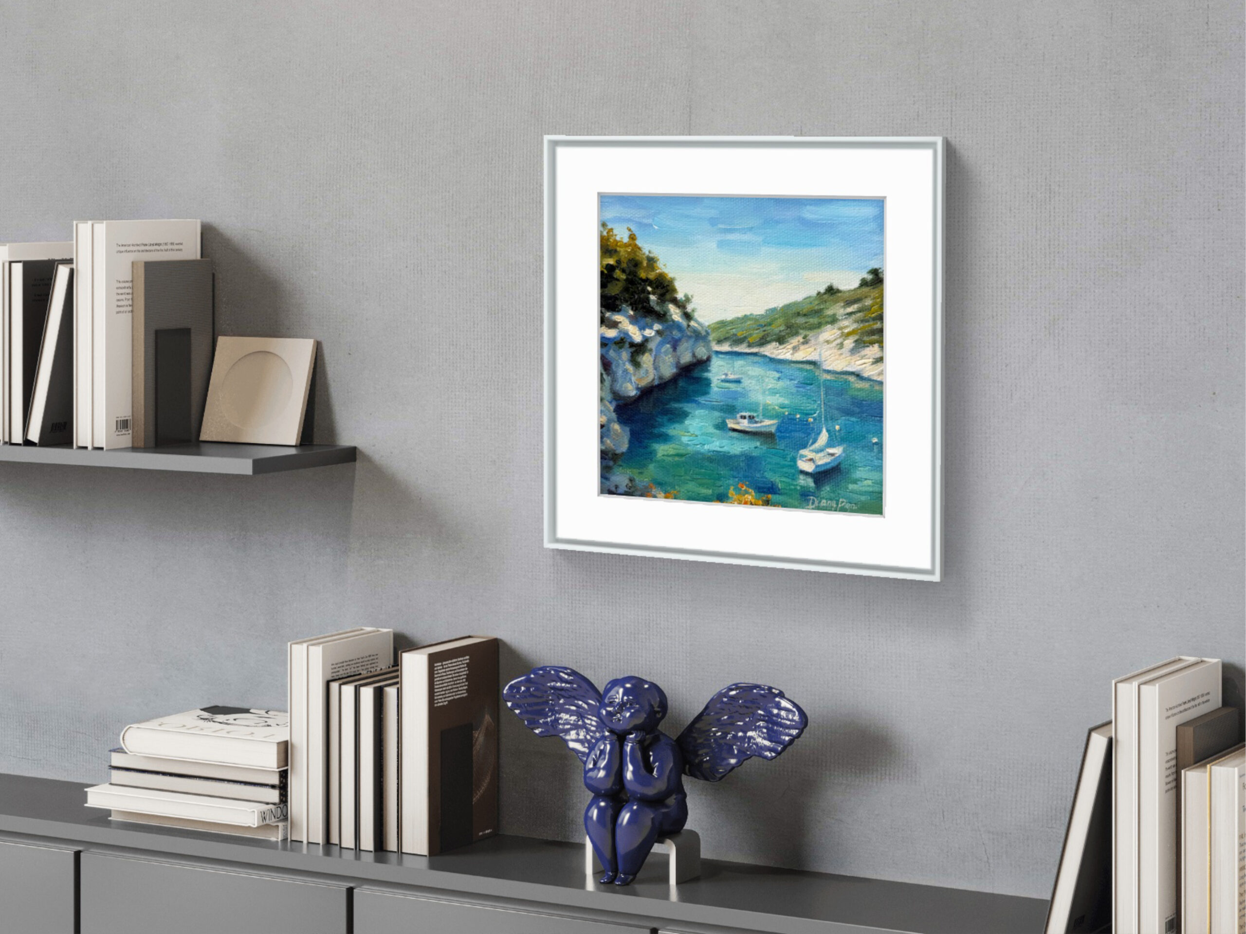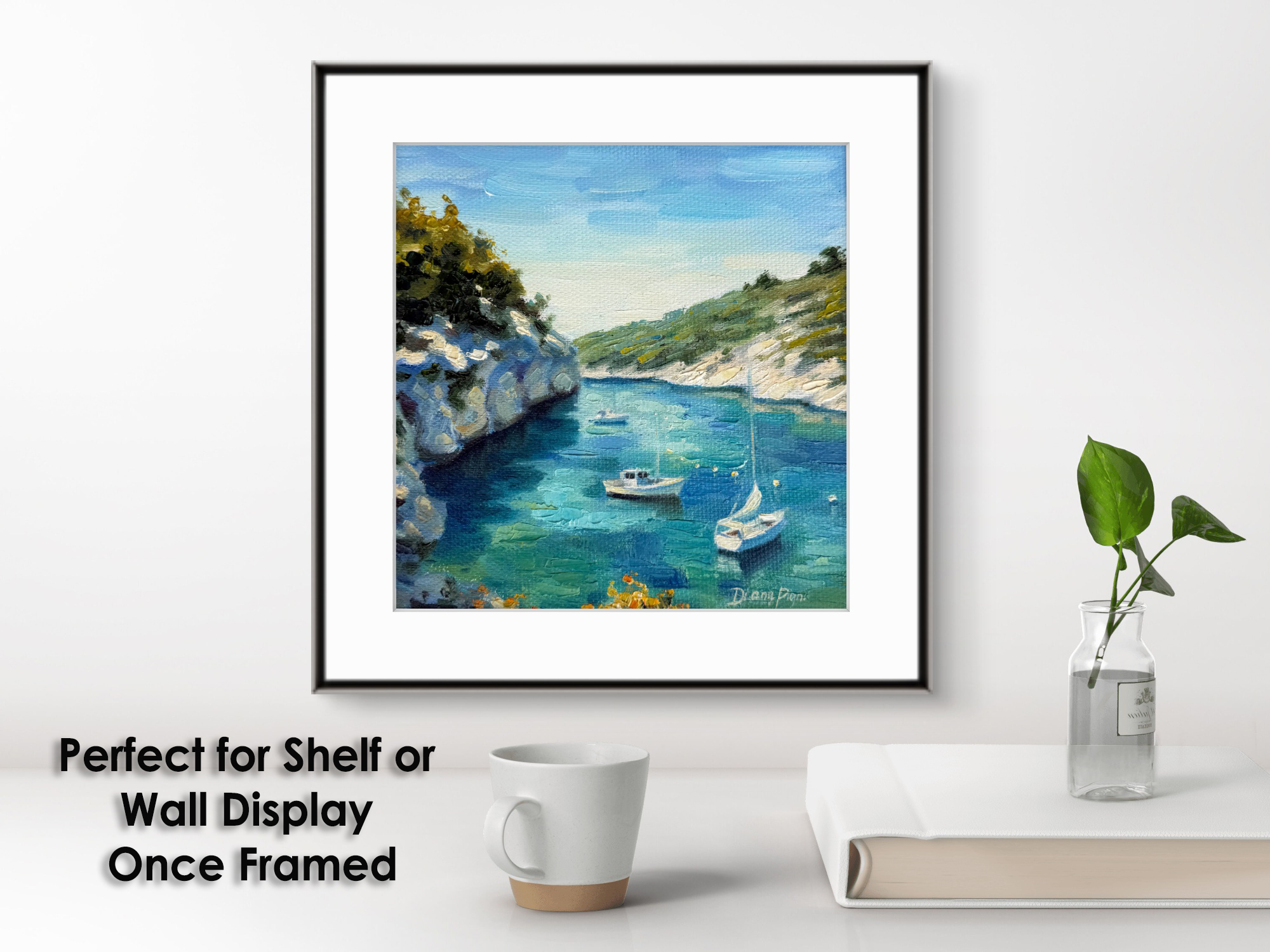 The vibrant turquoise water, sun-washed cliffs, and peaceful boats evoke the calm and elegance of the French Mediterranean coast, making this artwork perfect for a living room, bedroom, office, or coastal-inspired interior.
