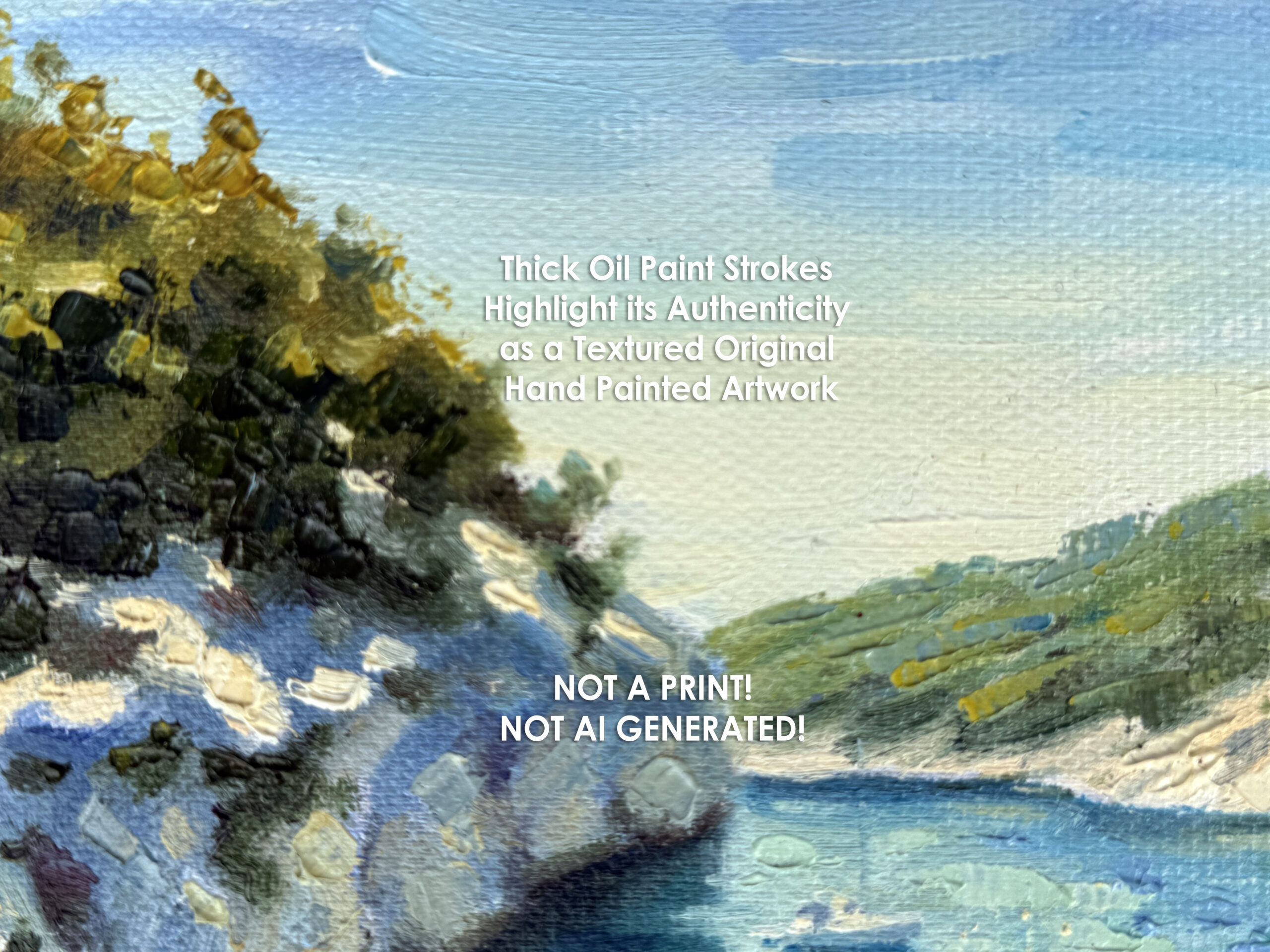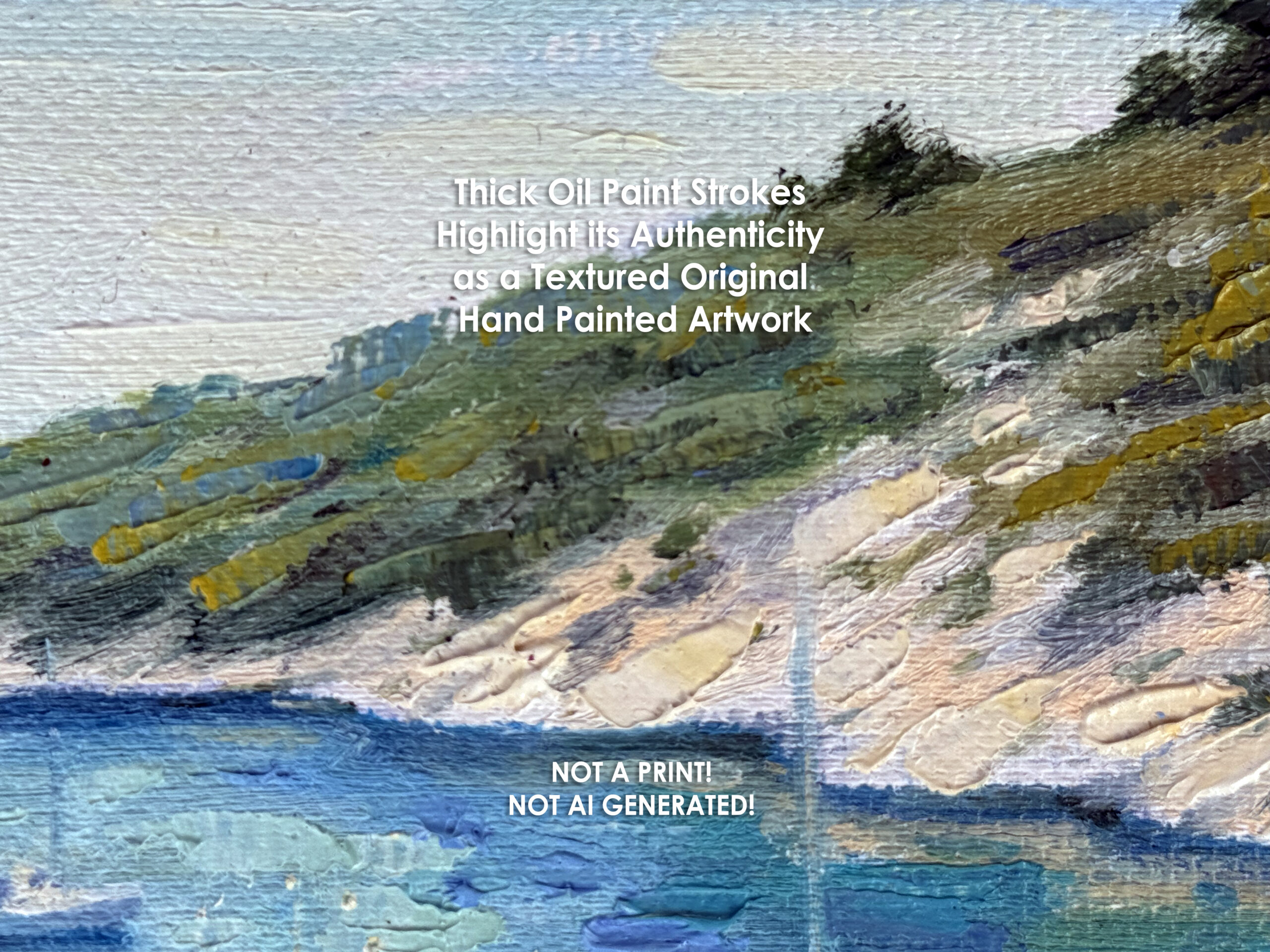 Bring the serene beauty of this sunny Seascape in Calanques, France into your space with this one-of-a-kind original oil painting, entirely hand painted from scratch by professional artist Diana Pigni.