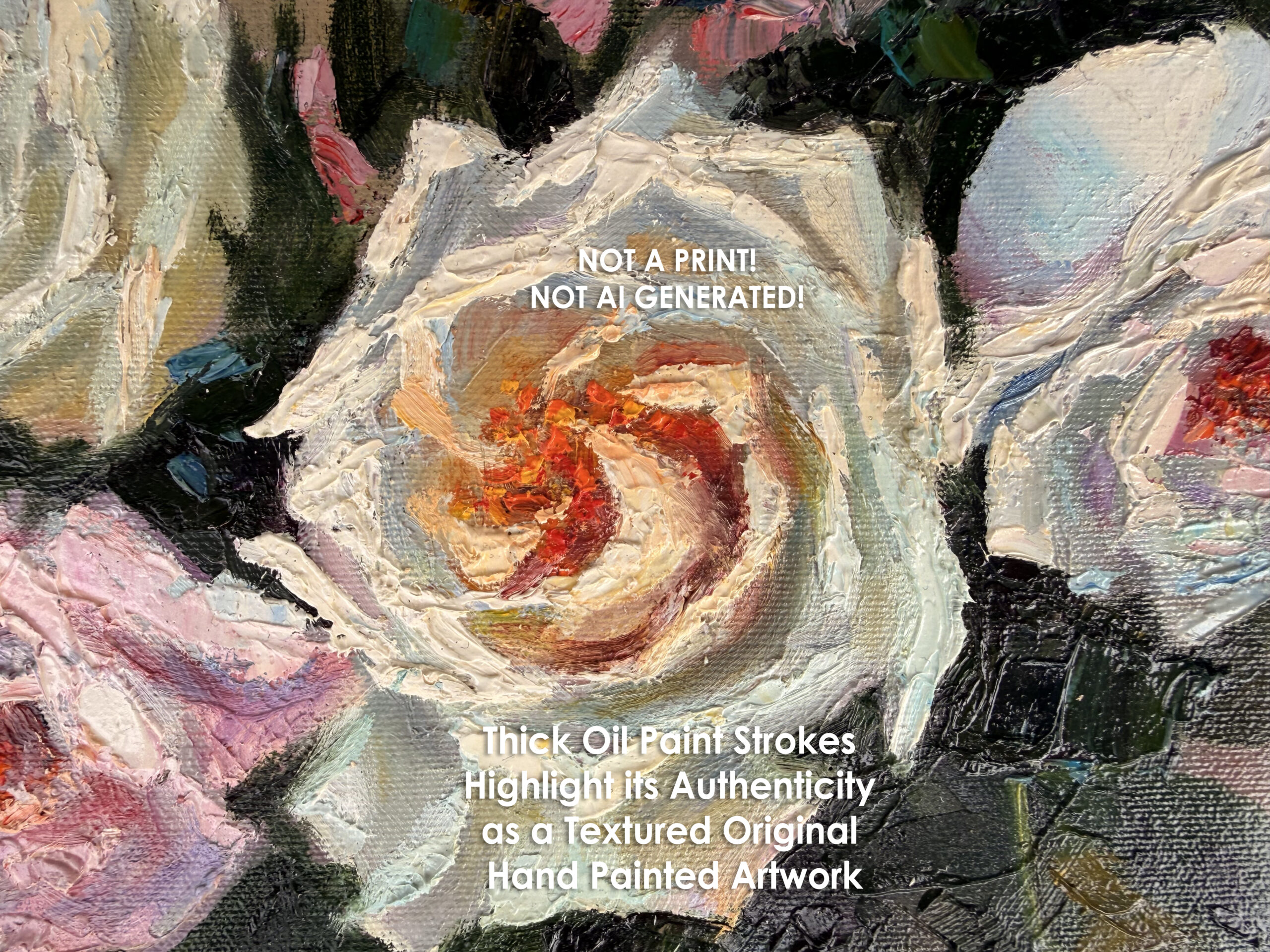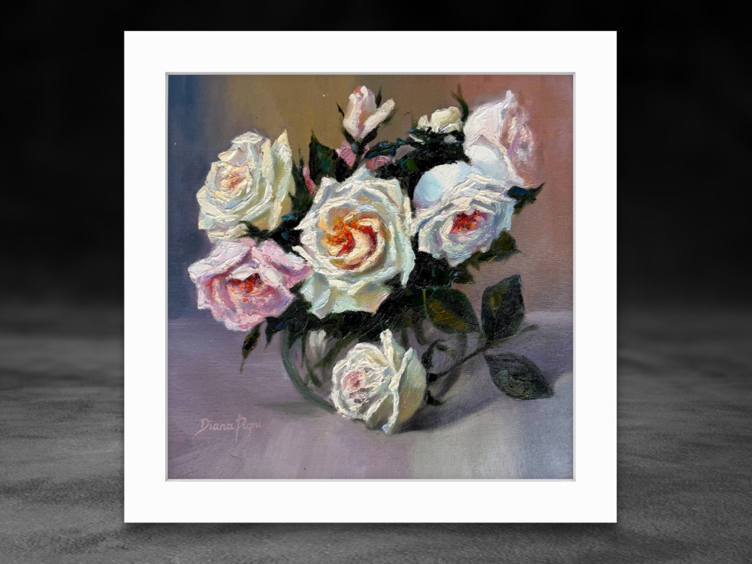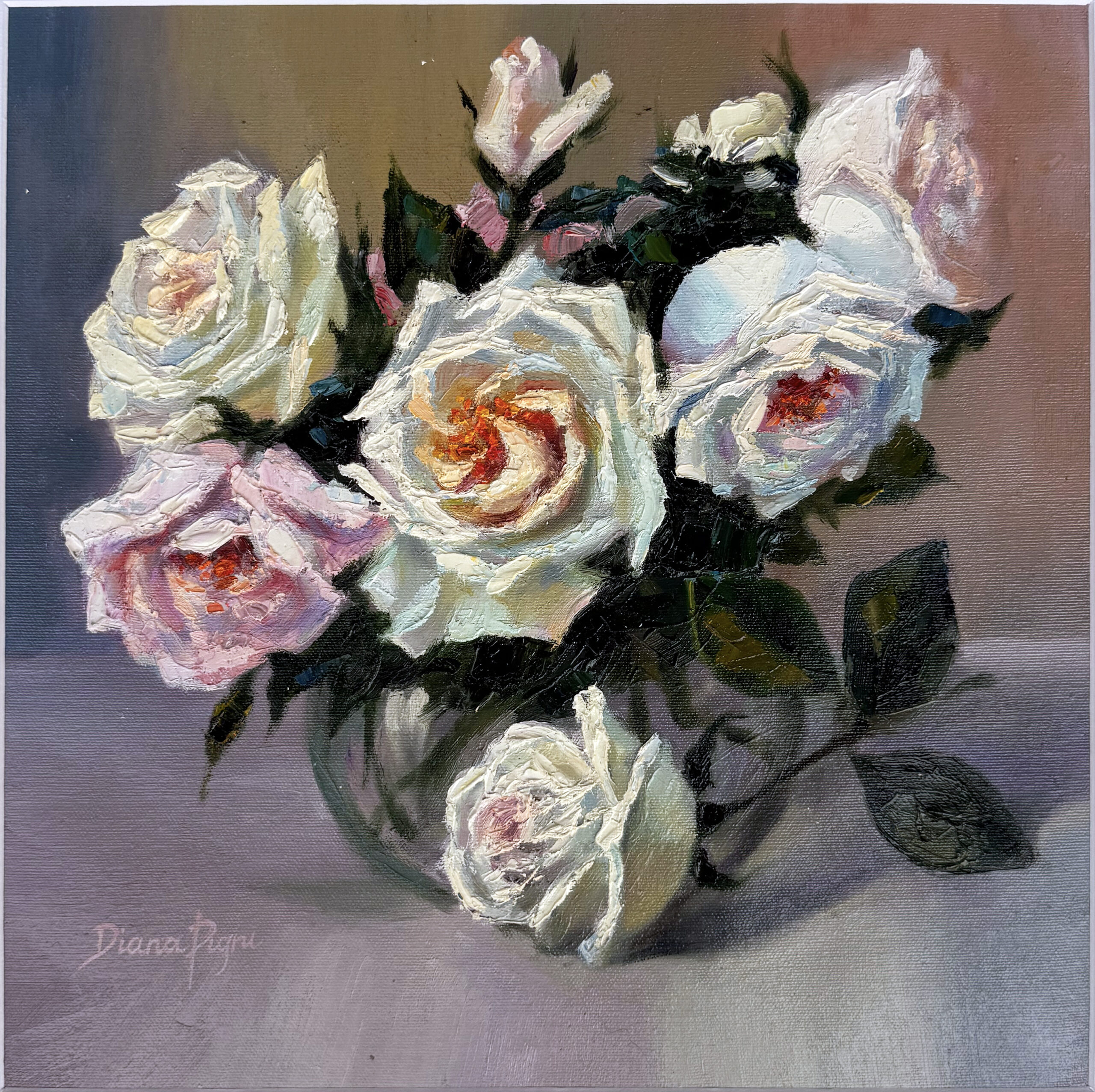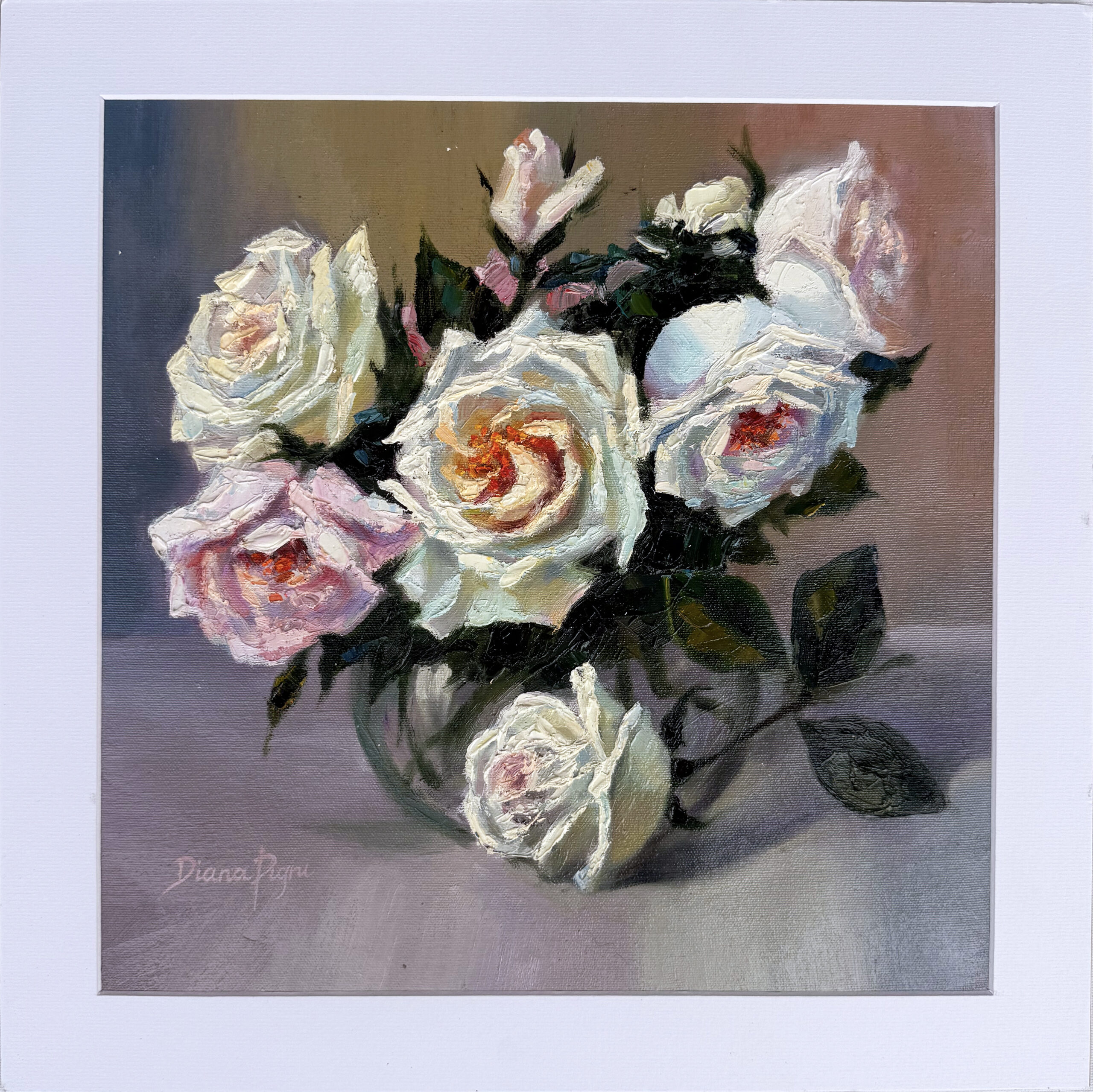 White & Blush Roses – Original Textured Impasto Oil Painting by Diana Pigni
