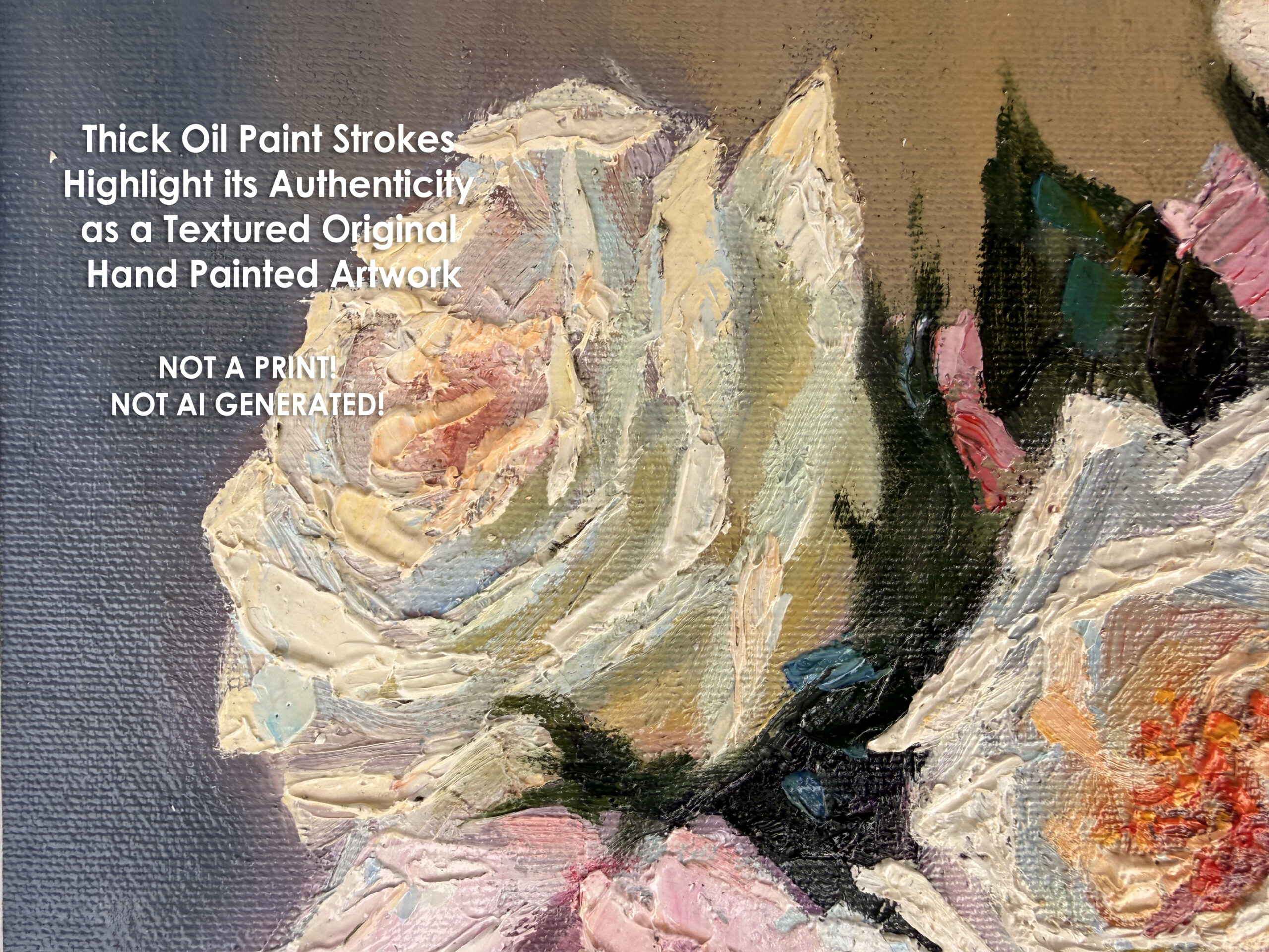 The gentle, muted background enhances the elegance of the bouquet, allowing the roses to stand out as a symbol of grace, love, and refinement. This artwork is entirely hand painted, making it a unique, one-of-a-kind piece.